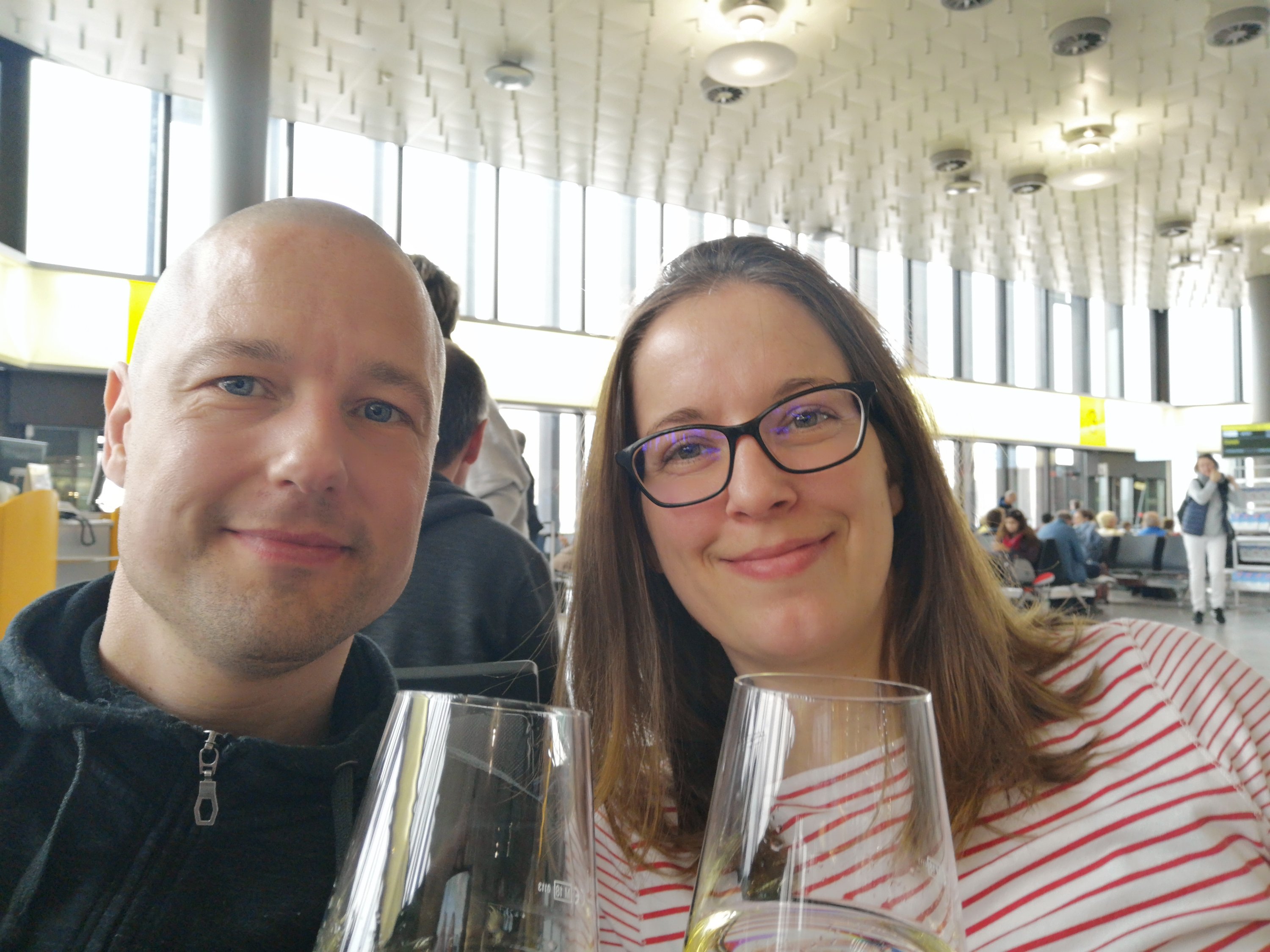 Wir hätten unsere Fahrt zum Flughafen starten können. Netterweise hat sich der Bruder von Hase2 angeboten, einen Familenausflug mit der großen Familienkutsche zu starten. Die Option fanden wir alle komfortabler und lustiger.Wir sind zwei Stunden vor Abflug am Flughafen angekommen. Es gab sogar eine kostenlose Weinverkostung vor dem Check-in.