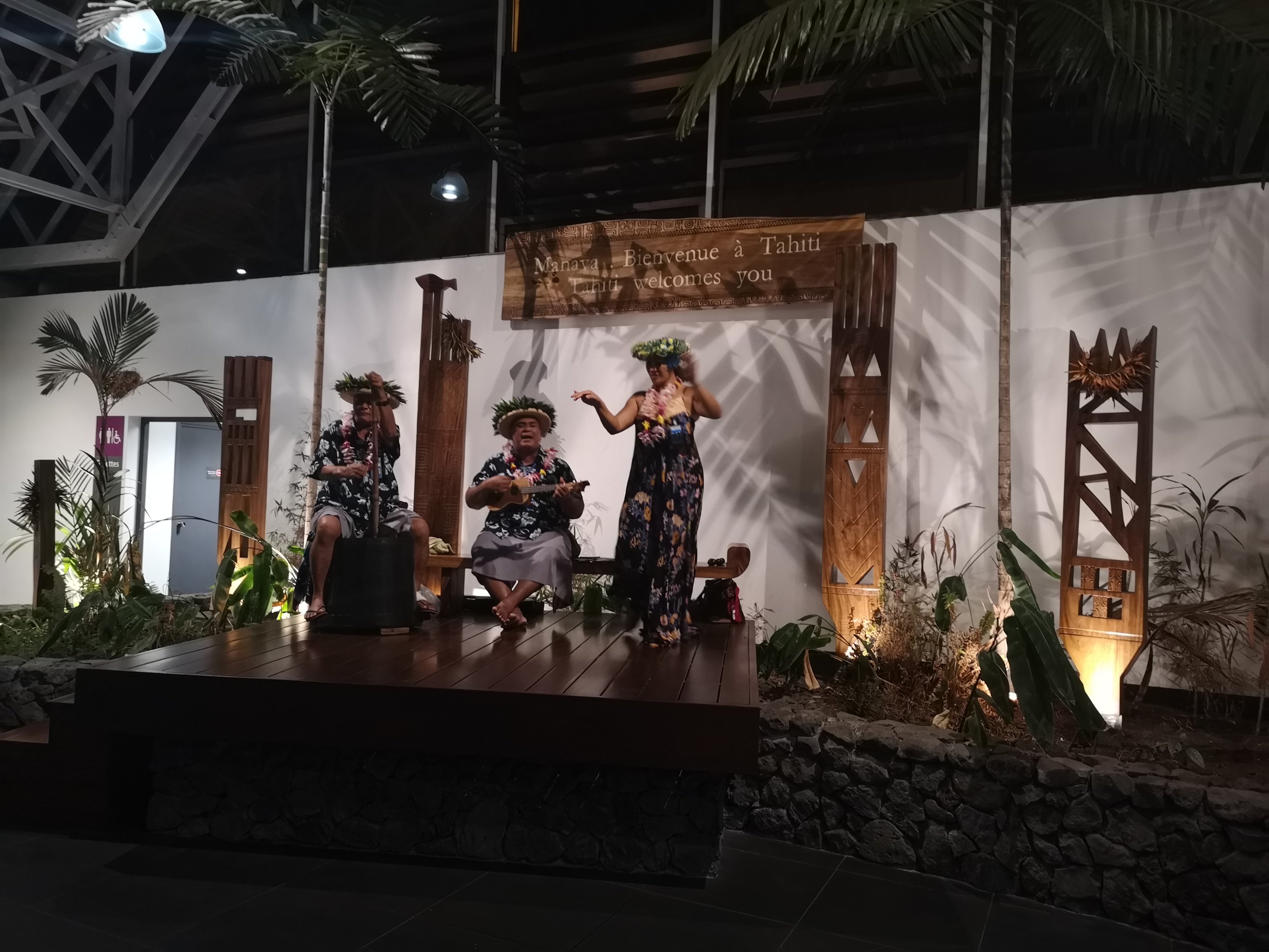 Nach zwei Filmen bzw. für Hase2 etwas Schlaf, sind wir um kurz vor Mitternacht auf Tahiti gelandet. Allerdings war es aufgrund der Zeitverschiebung dadurch für uns wieder Samstag. Wir sind also in der Zeit gereist 😉. Empfangen wurden wir mit einer kleinen Tanzeinlage.
