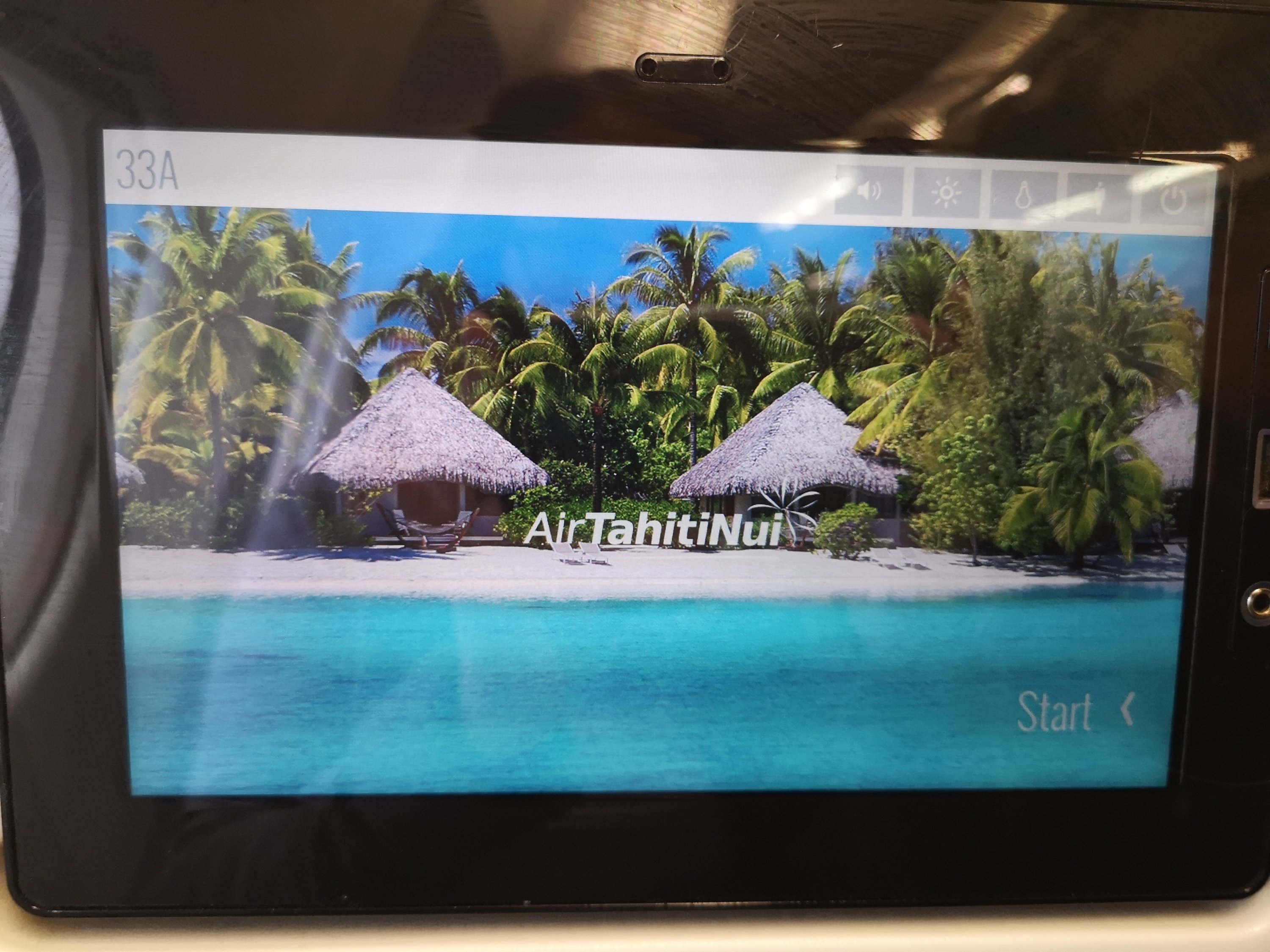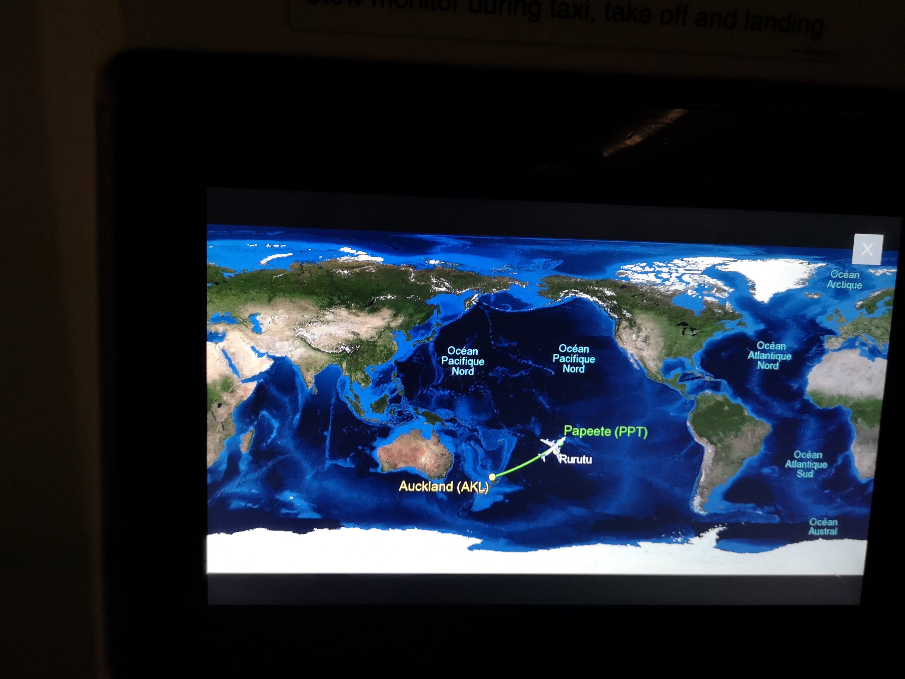Geflogen sind wir mit Air Tahiti Nui in einem relativ alten A340-300. Es gab ein wenig Filmauswahl im Boardprogramm aber leider vieles davon auf französisch. Immerhin mussten wir aber „nur“ 5 Stunden fliegen. Viele der anderen Fluggäste mussten nach einem kurzen Zwischenstopp auf Tahiti noch weitere 8 Stunden nach Los Angeles in der Maschine fliegen.